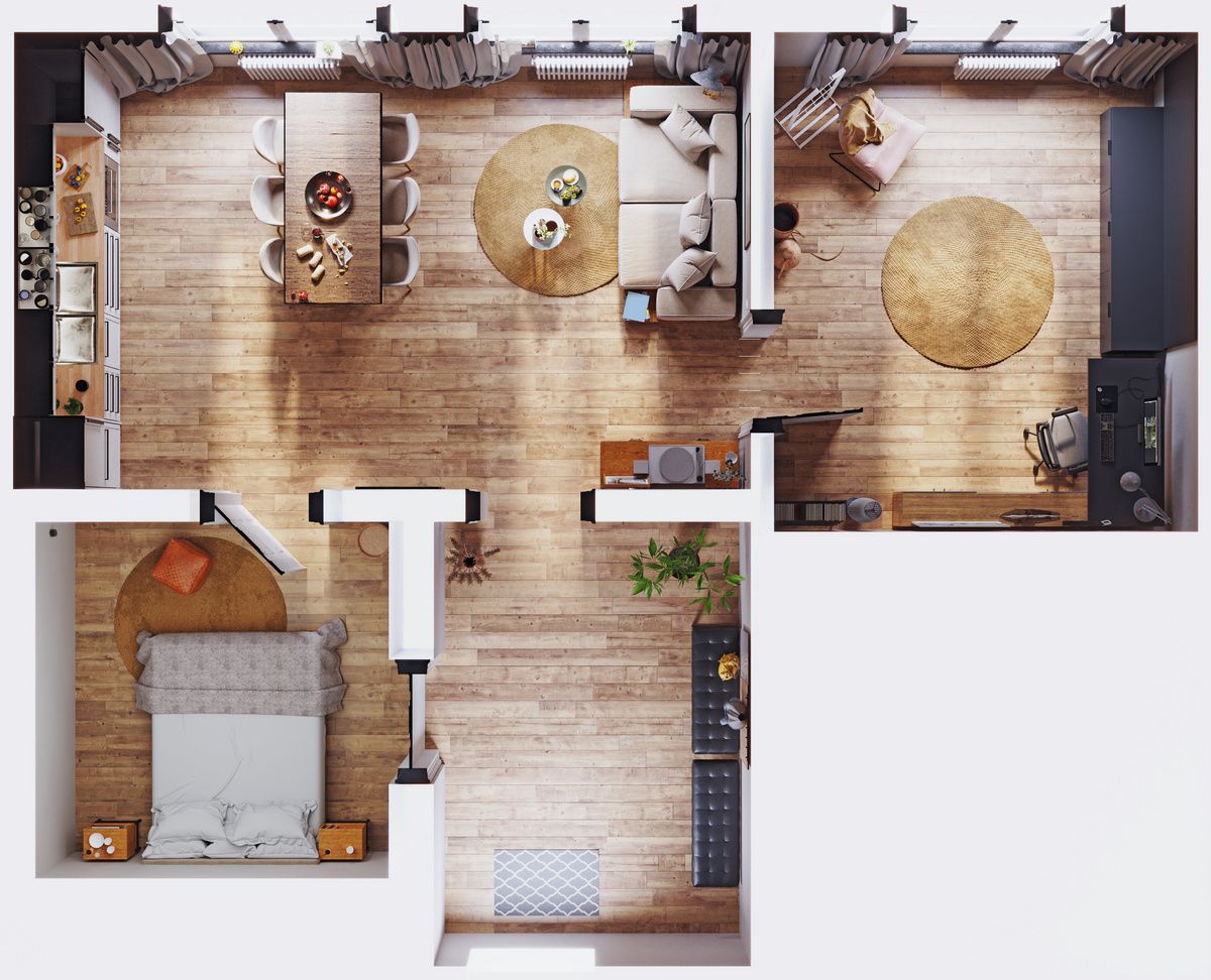 • 3D prikaze (vizualizacije): fotorealistične slike prostora koje prikazuju kako će interijer izgledati nakon izvedbe. Omogućuju investitoru da lakše zamisli konačan rezultat, doživi atmosferu prostora i eventualno napravi korekcije prije nego što radovi započnu. Vizualizacije su odličan alat za komunikaciju između dizajnera i klijenta.