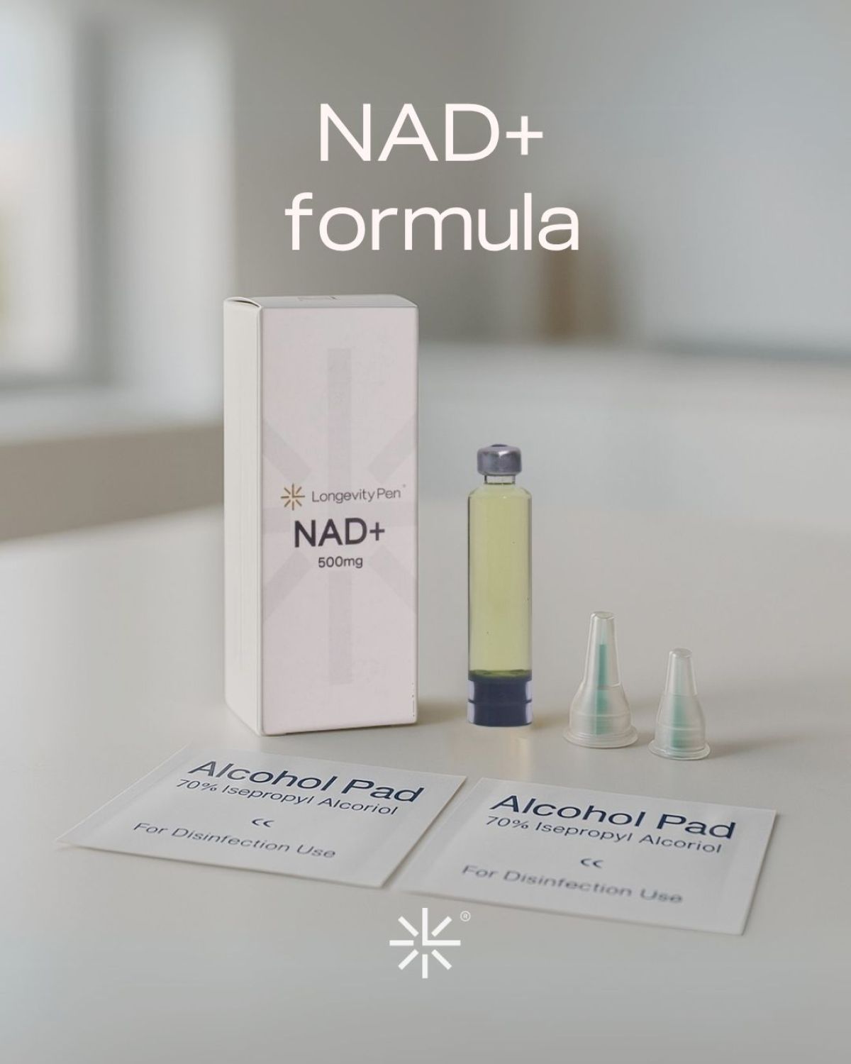 Longevity Pen dolazi u pažljivo osmišljenom Start paketu koji omogućuje jednostavan početak korištenja. Paket uključuje: višekratni Longevity Pen® uređaj dizajniran za precizno mikrodiziranje, unaprijed pripremljeni NAD+ uložak, prijenosnu torbicu s rashladnim umetkom za praktično čuvanje, alkoholne maramice i precizne igle za pravilnu primjenu. Sve je osmišljeno kako bi korisniku omogućilo intuitivno i sigurno iskustvo od prvog korištenja, bez kompleksnih koraka.