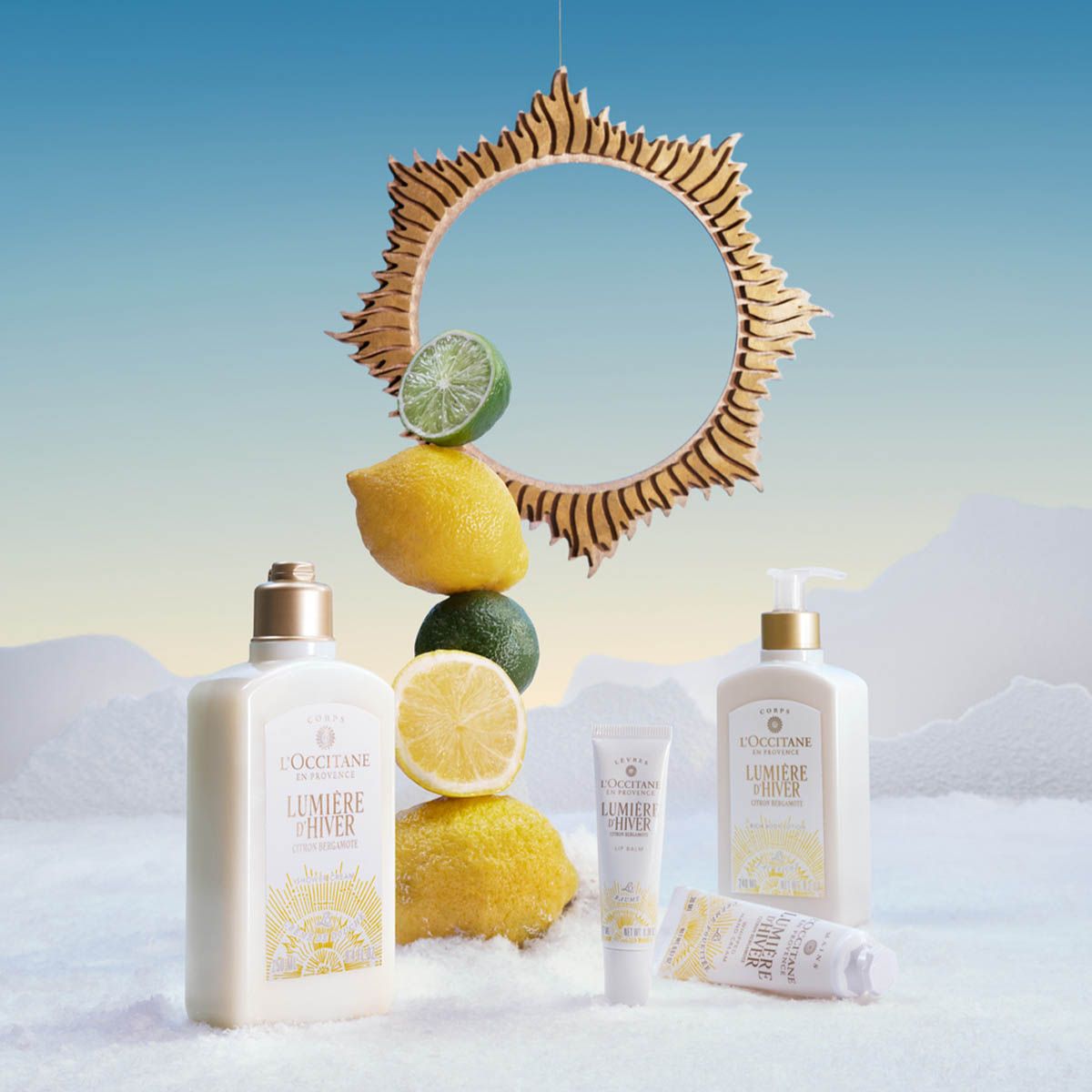 LUMIÈRE D’HIVER (Zimska svjetlost) Svjetlost živahnog podneva donosi citrusnu toplinu i zlatan sjaj. Provansalski krajolik kupa se u toploj sunčevoj svjetlosti, a zrak je prožet snažnom energijom citrusa. Miris Nerolija i citrusa tvore živahan buket, naglašen bergamotom i muškatnom kaduljom. Kolekcija je temeljena na bestsellerima s karite maslacem, poput kreme za tuširanje, mlijeka za tijelo i kremaste kreme za ruke.