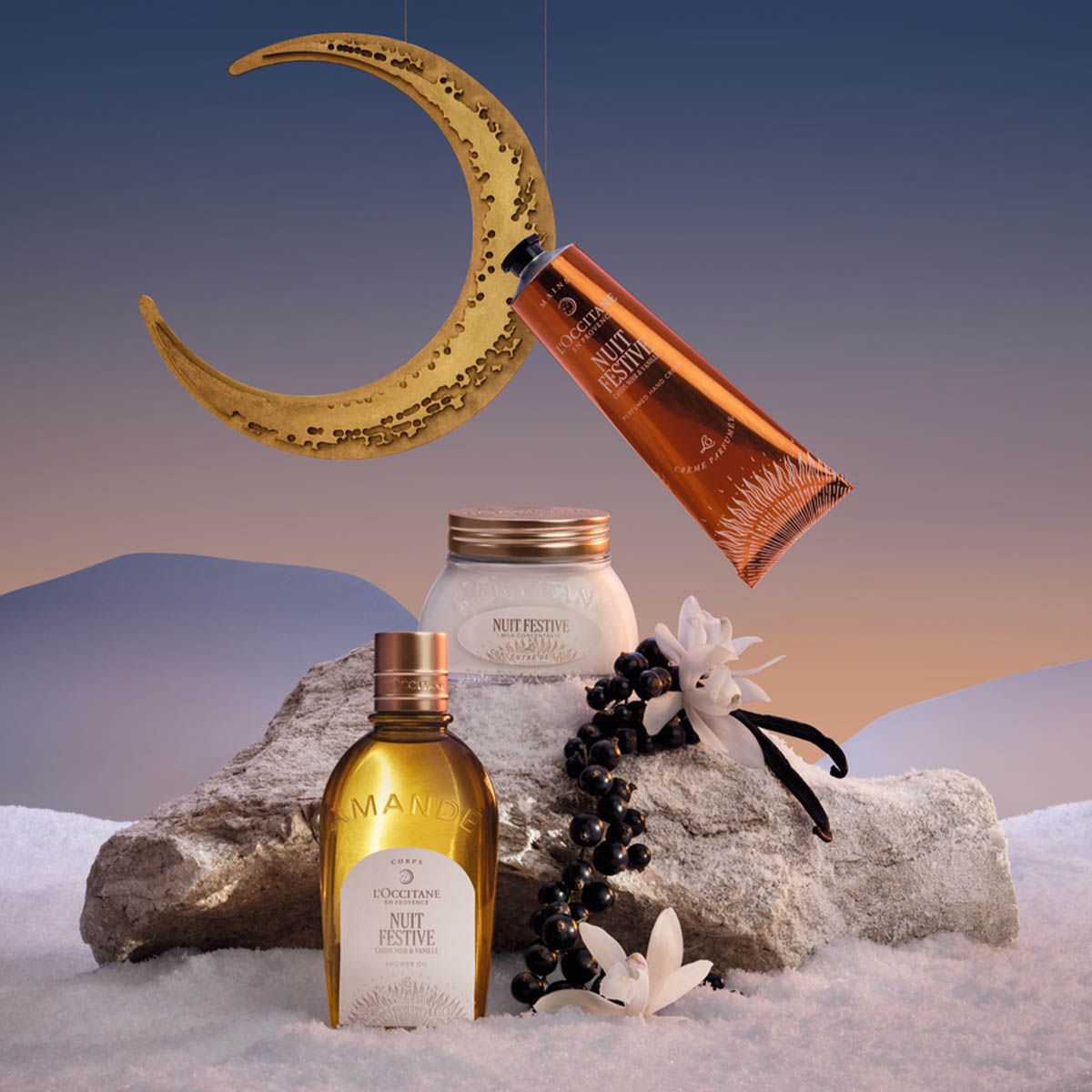 NUIT FESTIVE (Svečana noć) Svjetlost sumraka donosi iskričavu čaroliju i voćno-gurmanski miris večernjeg slavlja. Crni ribiz i bijelo vino stvaraju šampanjcu sličnu, veselu auru, koja vodi u slatku, izvrsnu bazu vanilije, cedrovine i hinokija – za veličanstvenu esencu noći. Kolekcija se temelji na omiljenim proizvodima s bademom (ulje i mlijeko za tijelo), a sadrži i očaravajuću toaletnu vodicu.