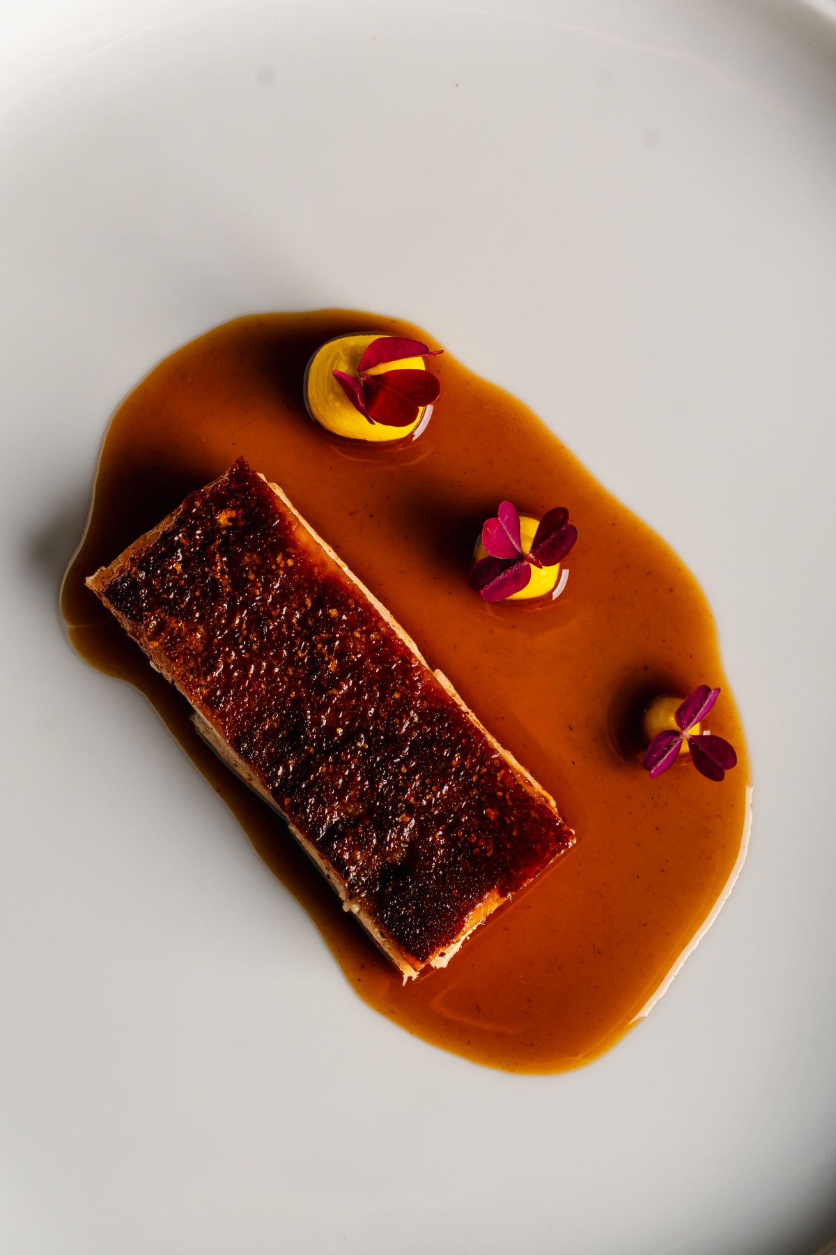 Dry-aged riba s mladim zimskim kupusom, consommé od pečene paprike i prženi pesto od začinskog bilja tek su uvod u jelovnik koji slavi jesen dok jadranska kozica s bučom i mandarinama samo nastavlja tu odu sezonalnosti.