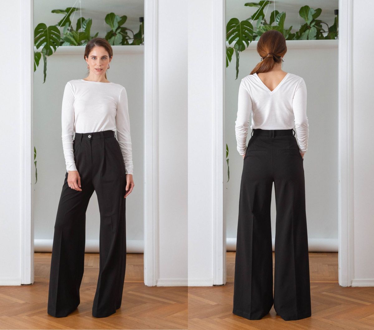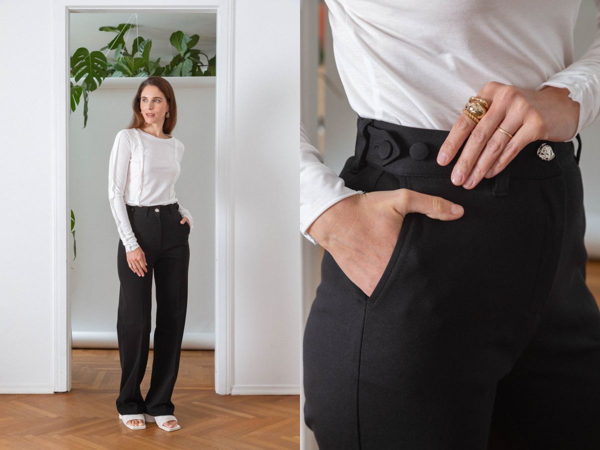 Pleated tailored pants - krojene za stvarne proporcije. Ove hlače su Nunnchi interpretacija savršenog ženskog kroja: dovoljno visoke za “balkanske kukove” i stvarnu žensku anatomiju dovoljno dugačke da i visoke žene mogu nositi pete precizno krojene da izdužuju nogu i oblikuju liniju. Za niže žene postoji mogućnost petit opcije - mogu se javiti direktno na e-mail za personalizirano skraćivanje u maloj seriji. Ovo je jedan od najtraženijih modela upravo zato što pristaje širokom rasponu tijela, a izgleda kao couture tailoring.