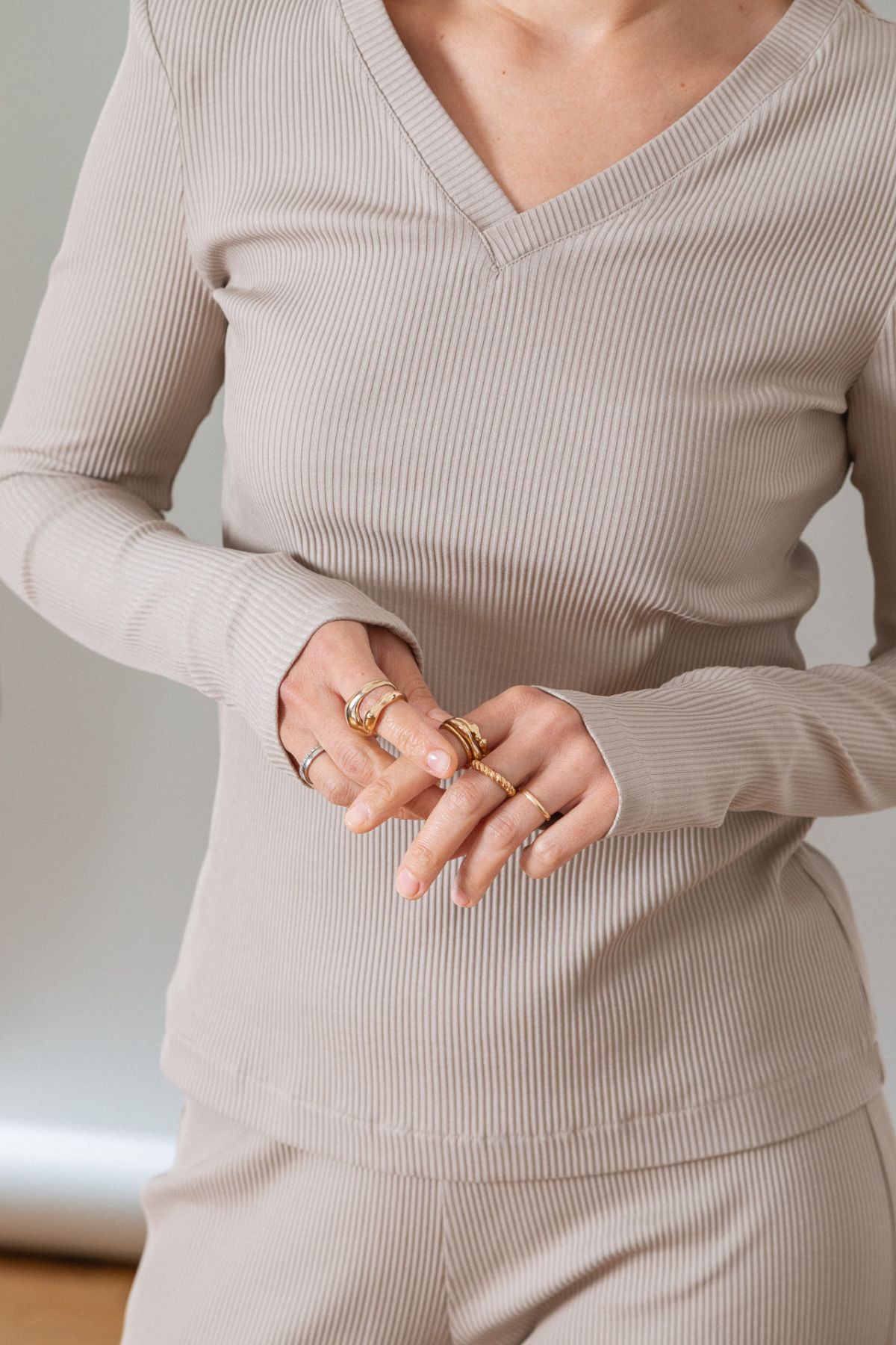 Rib knit set - od casual loungea do elegantnog kompleta Rib kompleti predstavljaju transformaciju svakodnevne udobnosti u sofisticirani outfit: V izrez i rameni jastučići za skulpturalnu siluetu duge hlače visokog struka koje izduzuju figuru Meko pletivo od 100% organskog pamuka omogućuje cjelodnevno nošenje, dok kroj i konstrukcija daju izgled modernog, minimalističkog outfit-a. Ovo je jedan od najnosivijih setova - od doma, preko posla, do casual izlazaka.