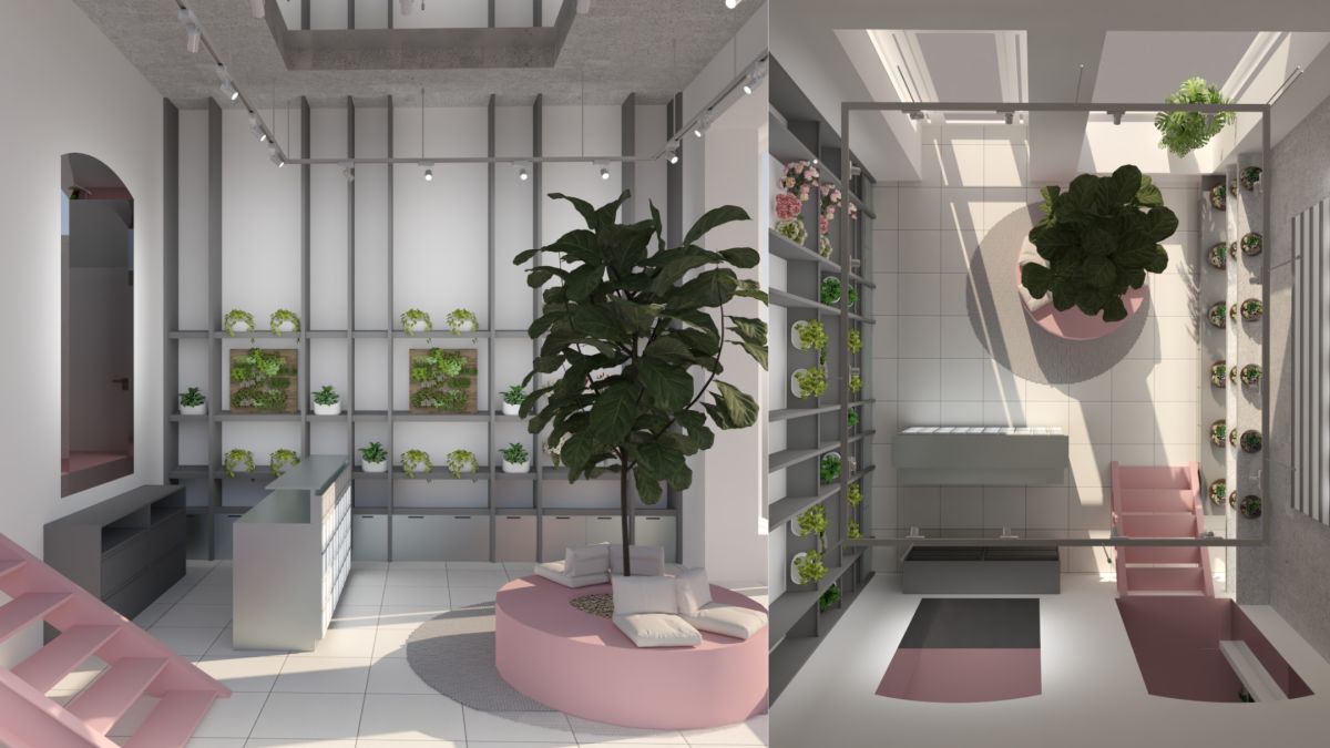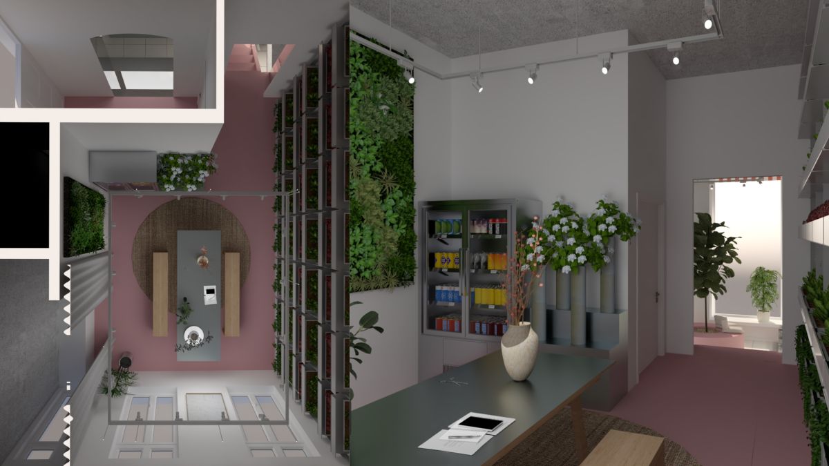Prostor je koncipiran kao multispace s tri funkcionalne zone: prednji izložbeni dio, stražnje skladište koje je namjerno ostavljeno otvorenim kupcima te viša poluetaža za radionice i edukacije. Kupac se tako može slobodno kretati kroz cijeli prostor, vidjeti “iza kulisa” i odabrati točno onu biljku ili terarij koji mu se sviđa. Biljke se nekoliko puta tjedno intenzivno zalijevaju i održavaju, pa je odabran pod koji podnosi vodu i lako se čisti, a cijeli je prostor zoniran tako da i nakon održavanja ostaje uredan i reprezentativan.