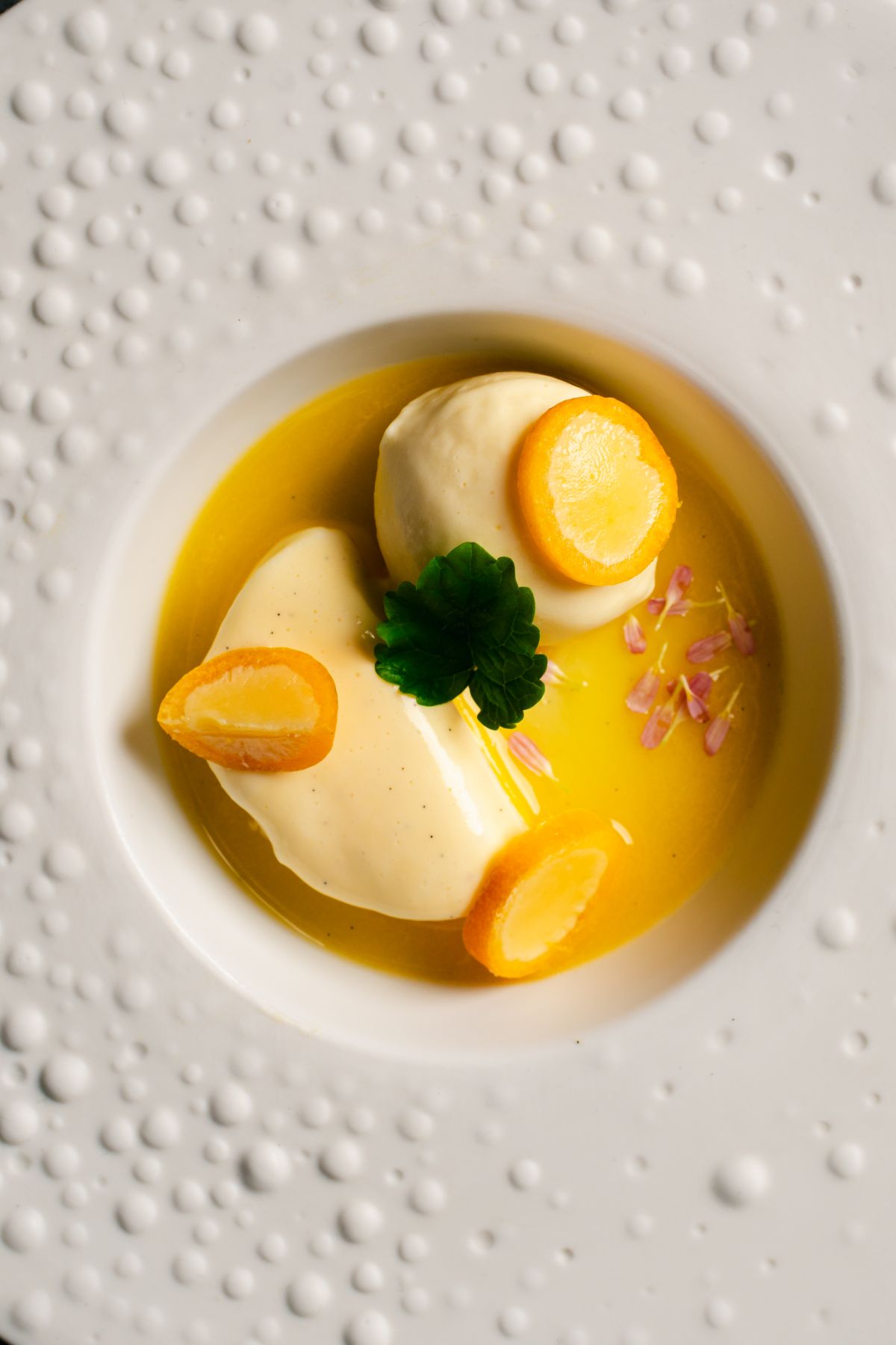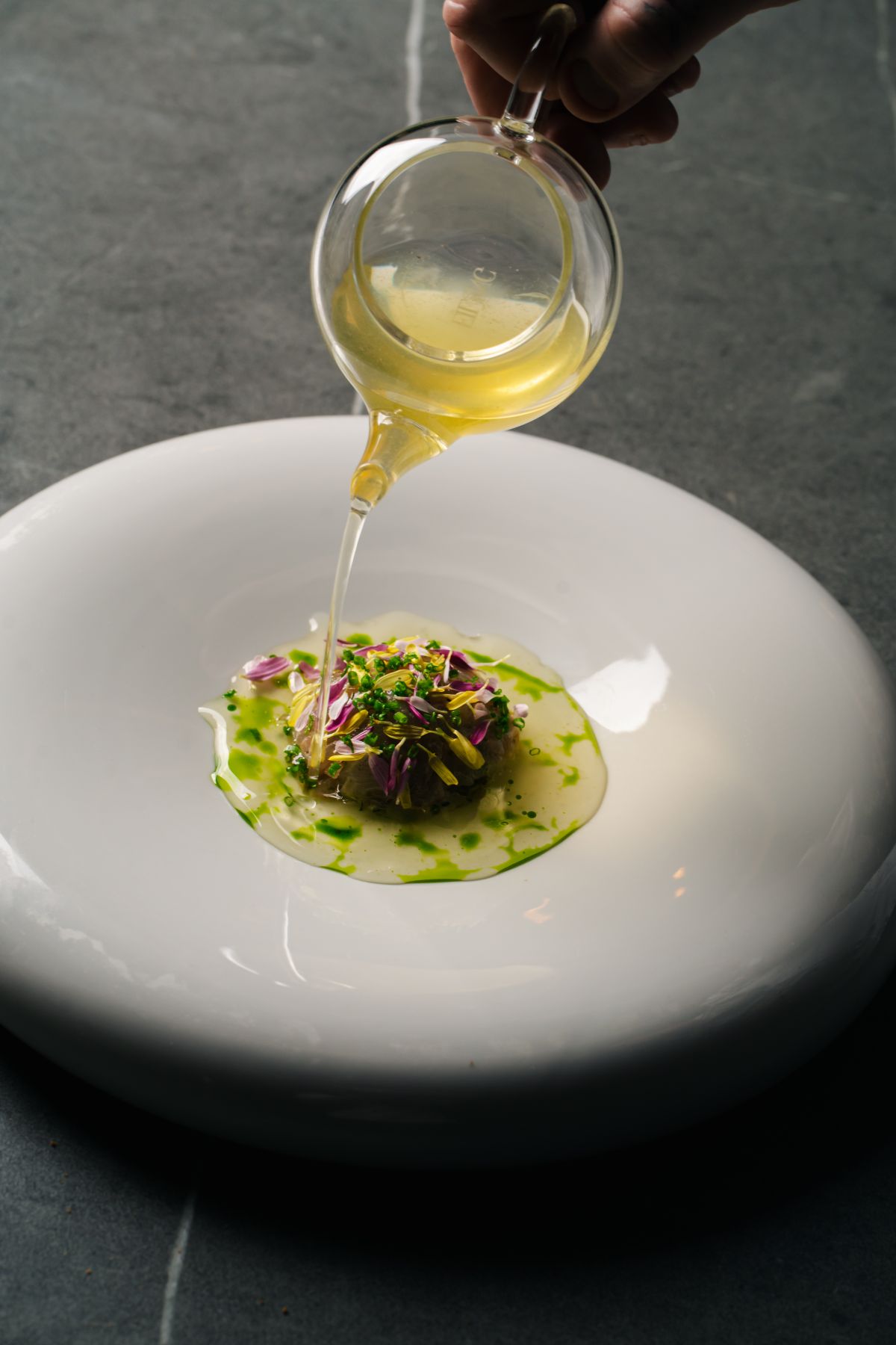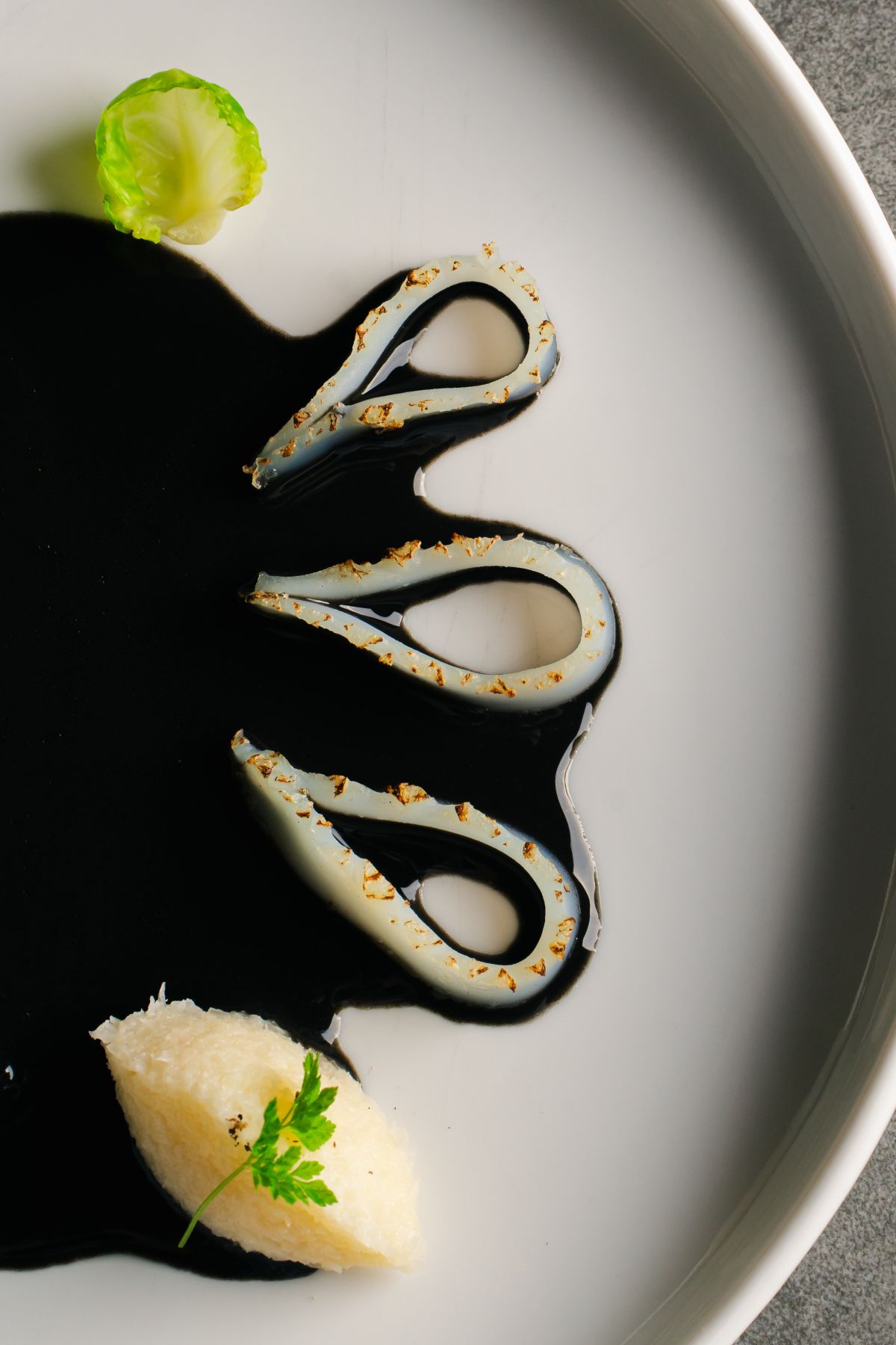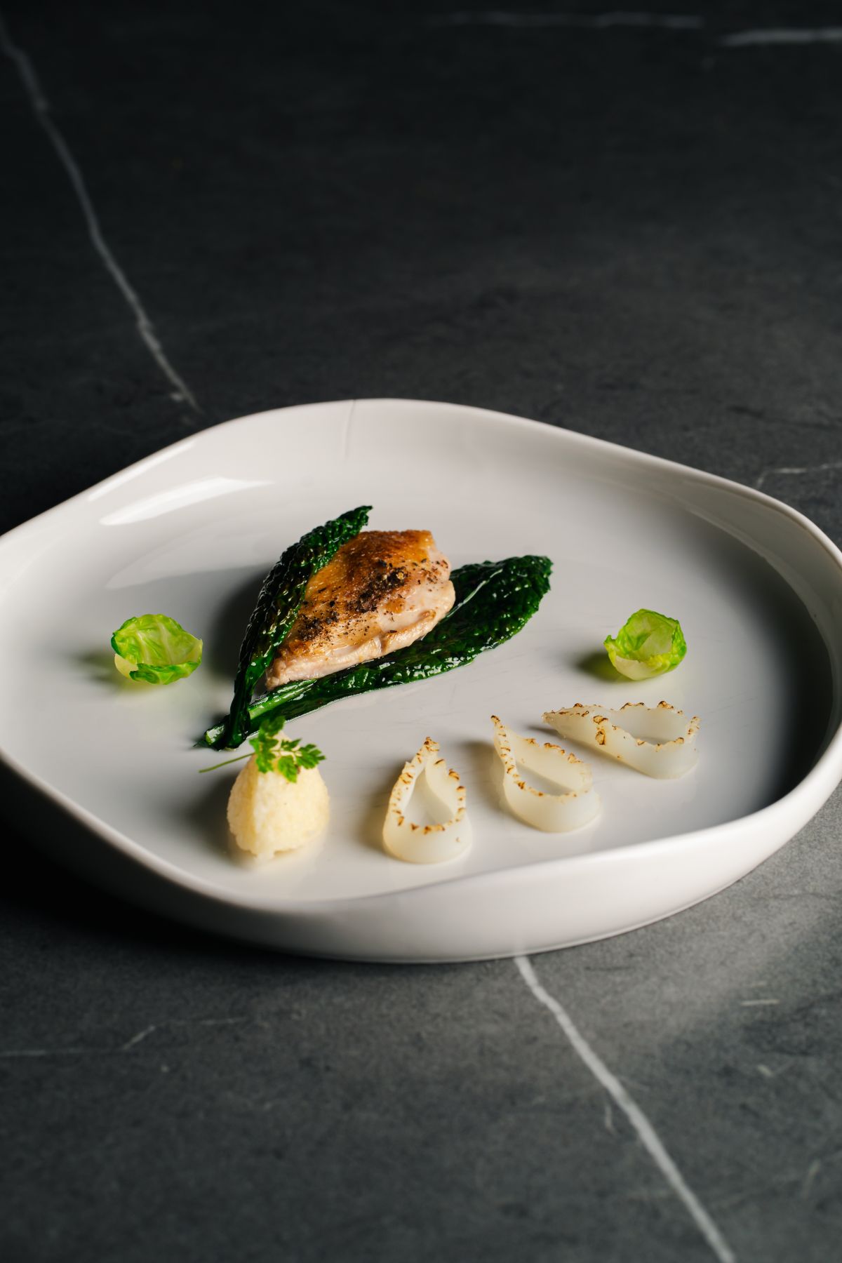Dry-aged riba s mladim zimskim kupusom, consommé od pečene paprike i prženi pesto od začinskog bilja tek su uvod u jelovnik koji slavi jesen dok jadranska kozica s bučom i mandarinama samo nastavlja tu odu sezonalnosti.