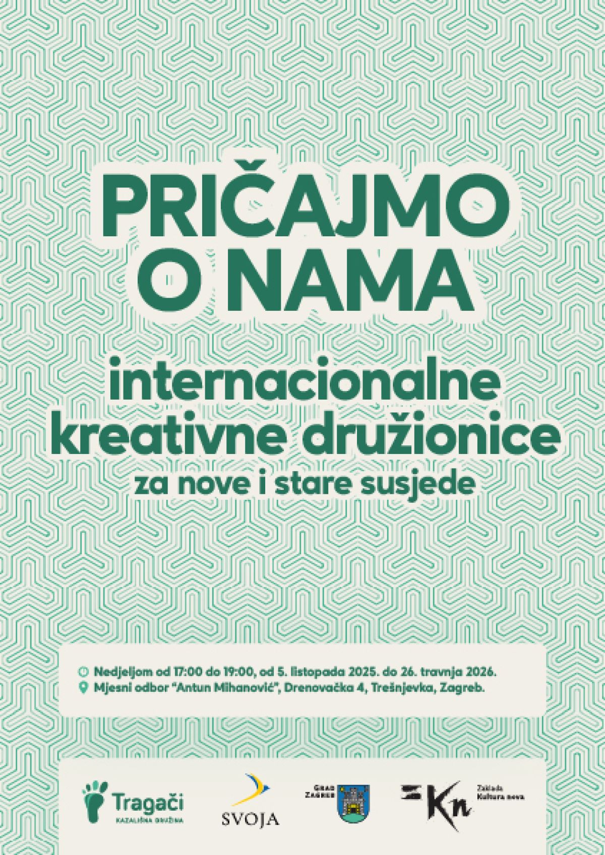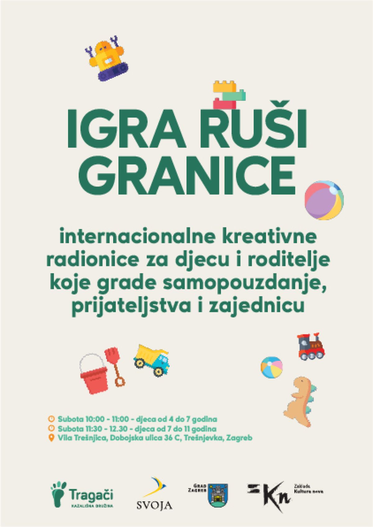 Kazališna družina Tragači i udruga Svoja pokreću dva posebna vikend-programa za djecu i odrasle: „Igra ruši granice“ i „Pričajmo o nama“ – radionice koje potiču kreativnost, igru, zabavu, a sve u komunikaciji stanovnika Trešnjevke ili i šire te obitelji doseljenika iz Ukrajine. Cilj je jednostavan: stvoriti siguran prostor u kojem se svi osjećaju dobrodošlo, a kroz igru i kreativnost grade se samopouzdanje, prijateljstva i zajednica.