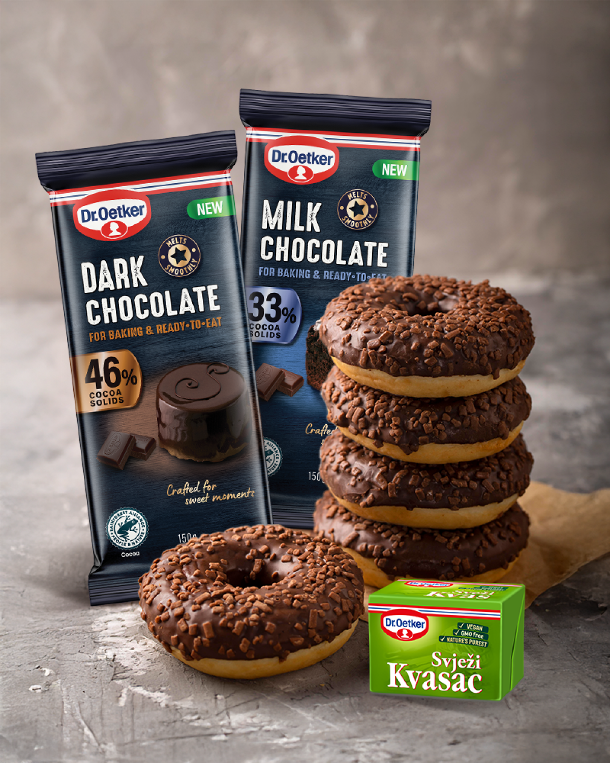 Posebnu čar domaćem pečenju daje spoj svježeg kvasca i kvalitetne čokolade. Taj “power couple” već generacijama osvaja nepca, bilo kroz punjene krafne, čokoladne buhtle, brioche s komadićima kakaa ili topli kruh s otopljenom čokoladom. Dr. Oetker u svojoj ponudi nudi mliječnu i tamnu čokoladu za kuhanje, koje se savršeno stapaju s mekanim tijestom i stvaraju uravnotežen spoj slatkoće, arome i teksture.